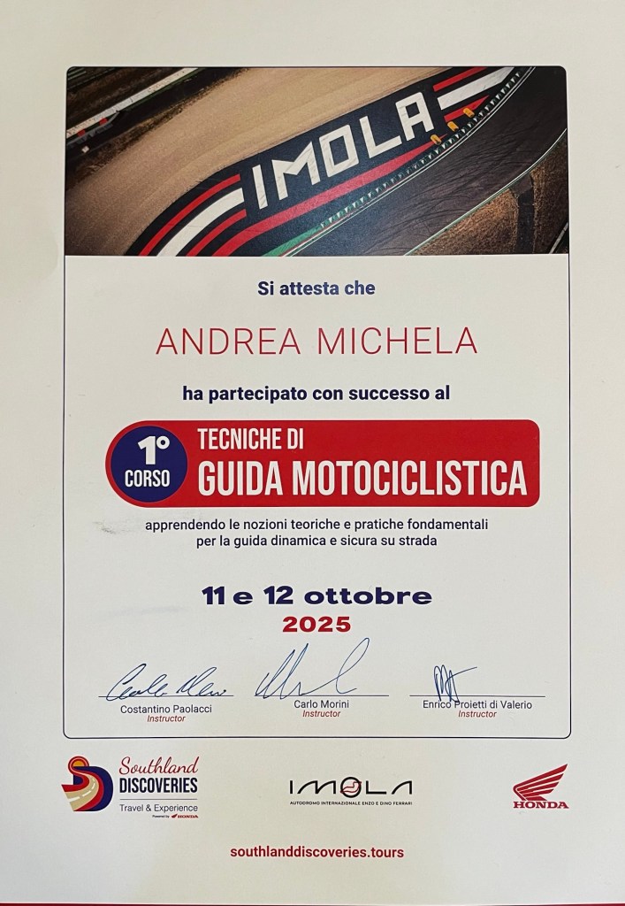 Questo weekend ho fatto un Corso di Tecniche di Guida Motociclistica organizzato a Imola da Southland Discoveries con Costantino Paolacci, Carlo Morini e Enrico Proietti di Valerio e come il cieco nato ho aperto finalmente gli occhi su come si va in moto e soprattutto sul perchè farlo in un certo modo piuttosto che in un altro.